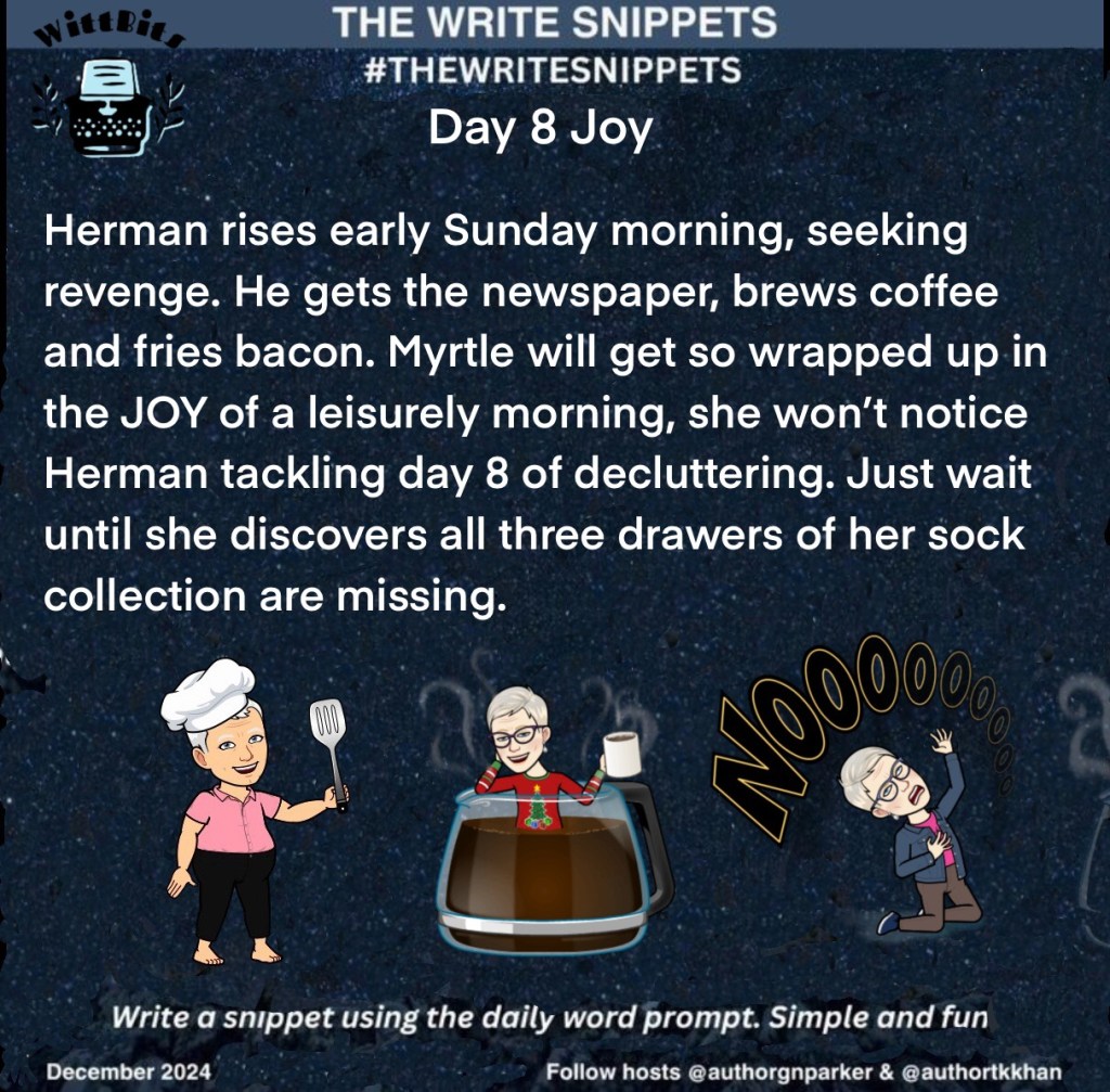 Herman rises early Sunday morning, seeking revenge. He gets the newspaper, brews coffee and fries bacon. Myrtle will get so wrapped up in the JOY of a leisurely morning, she won’t notice Herman tackling day 8 of decluttering. Just wait until she discovers all three drawers of her sock collection are missing.