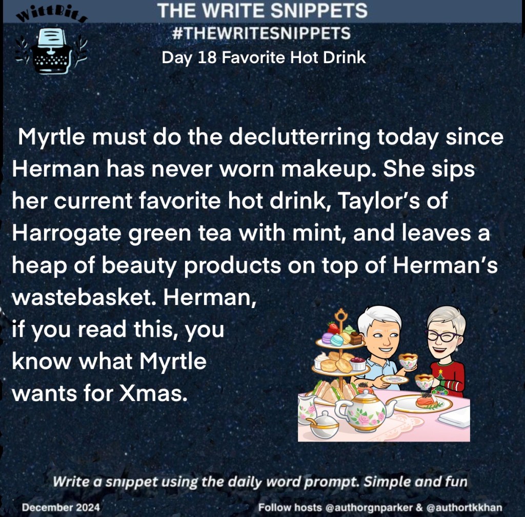 Myrtle must do the declutterring today since Herman has never worn makeup. She sips her current favorite hot drink, Taylor’s of Harrogate green tea with mint, and leaves a heap of beauty products on top of Herman’s wastebasket. Herman, if you read this, you know what Myrtle wants for Xmas.