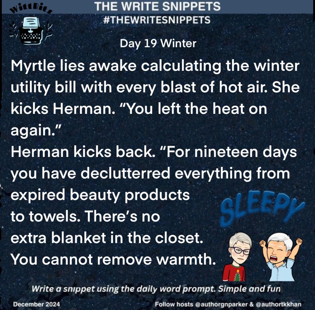 Myrtle lies awake calculating the winter utility bill with every blast of hot air. She kicks Herman. “You left the heat on again.”